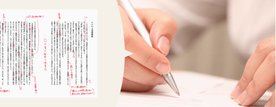 冒頭の1,000文字程度に添削いたします。出版のルールに沿って、誤字脱字、表記統一、表現など、本づくりのプロならではの観点からアドバイス。普段、SNSやブログなどで文章を書き慣れている方でも、本の出版のルールとして初めて知ることも多いはず。原稿の推敲に、きっとお役立ていただけますよ。 |